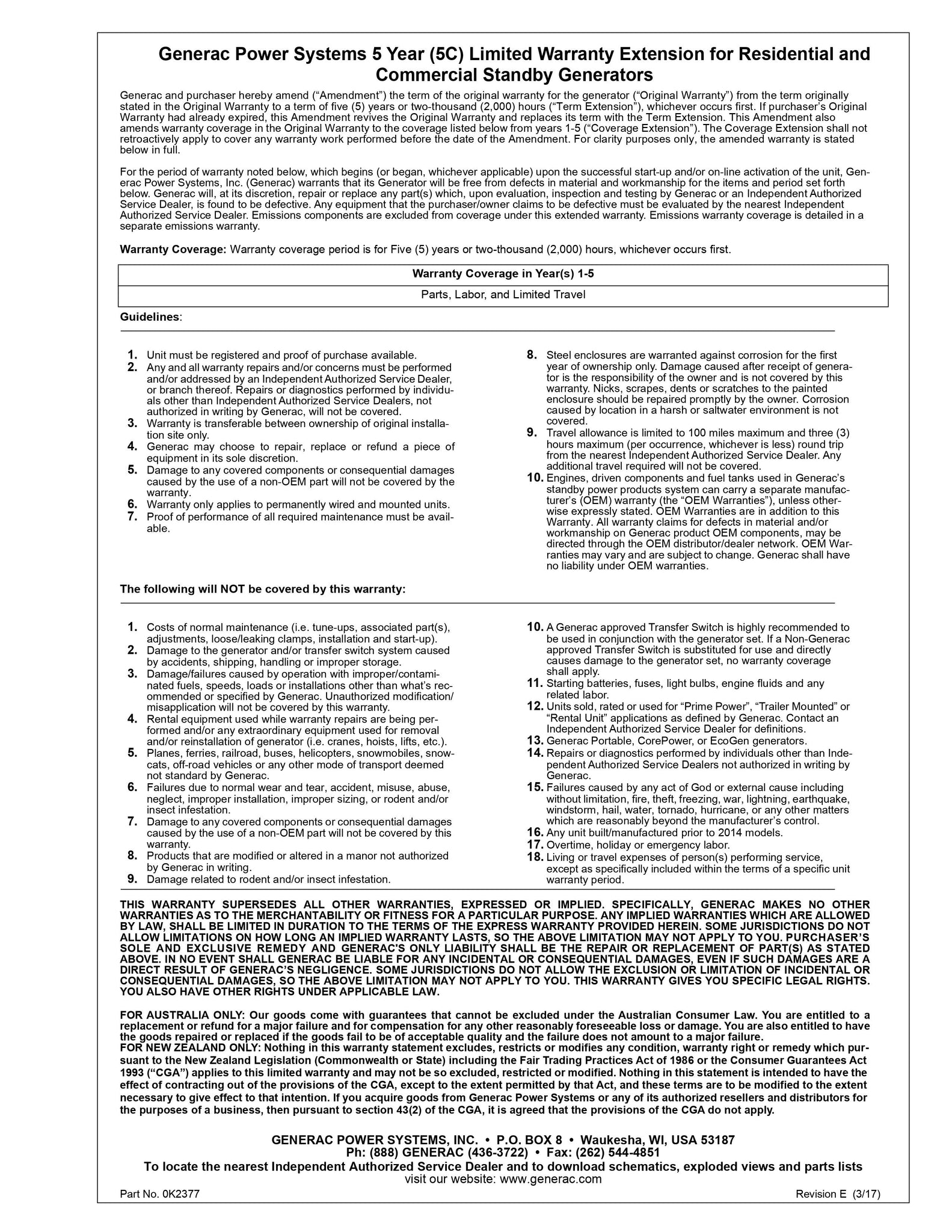Generac 5 year extended warranty for air cooled generators covers parts, labor and limited travel for 5 years or 2000 hours (whichever comes first). This warranty must be purchased within the first 12 months after installation of your generator.